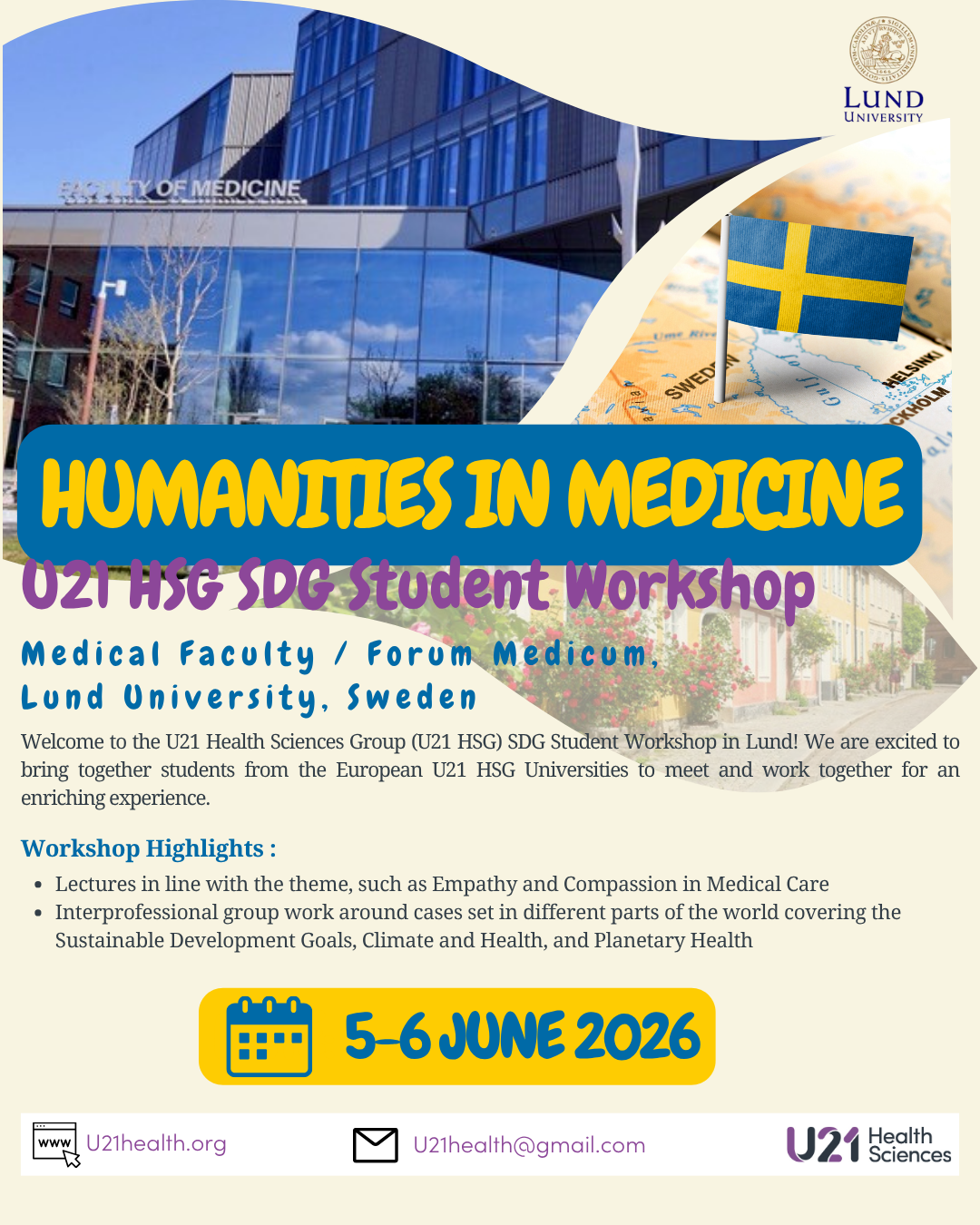 The 2026 SDG Student Workshop was hosted at the Faculty of Medicine, Lund University, Sweden from 5-6 June 2026 on the topic of “Humanities in Medicine” .